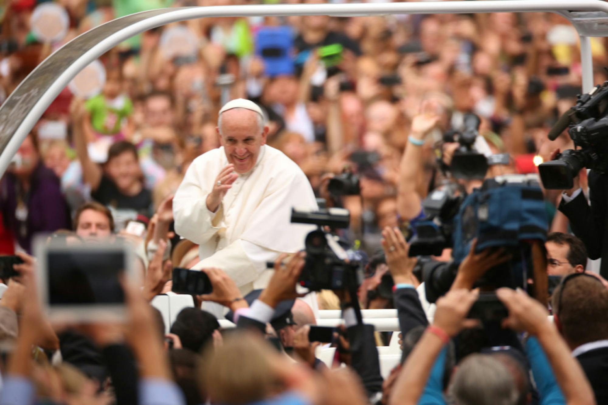 Pope Francis greets the crowd during a parade on the Benjamin Franklin Parkway in Philadelphia Sunday. (Damon Winter / The New York Times)
