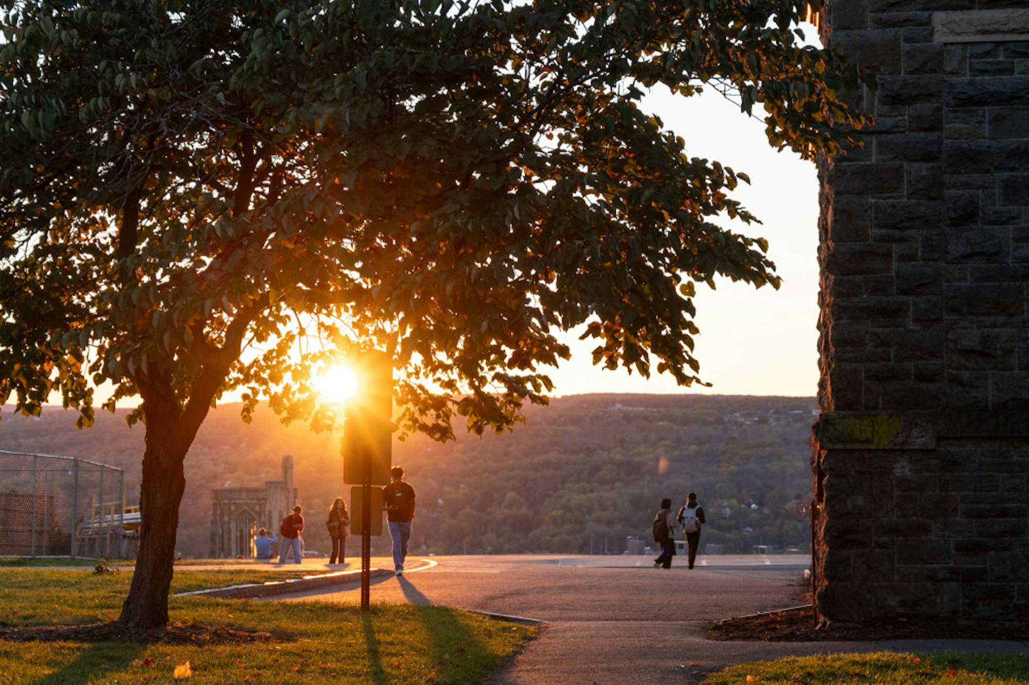 SUNRISE | Students walk to class as the sun rises over Libe Slope. (Nathan Ellison/Sun Staff Photographer)