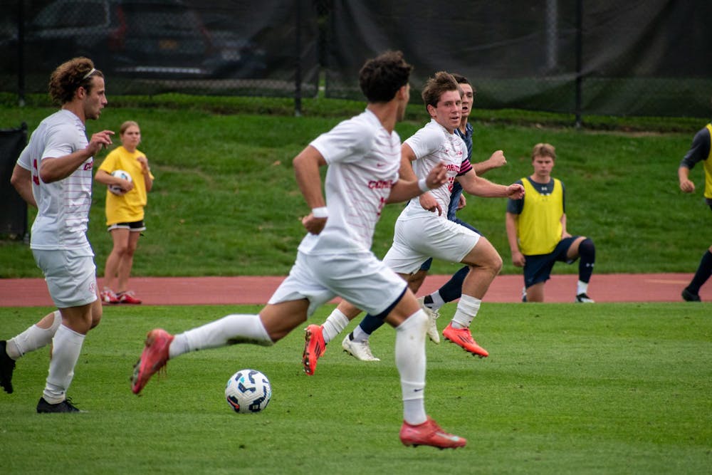 Conner Miller, Daniel Samways and Sam Latona running towards the Yale goal on Sept. 27. Camille Eckert
