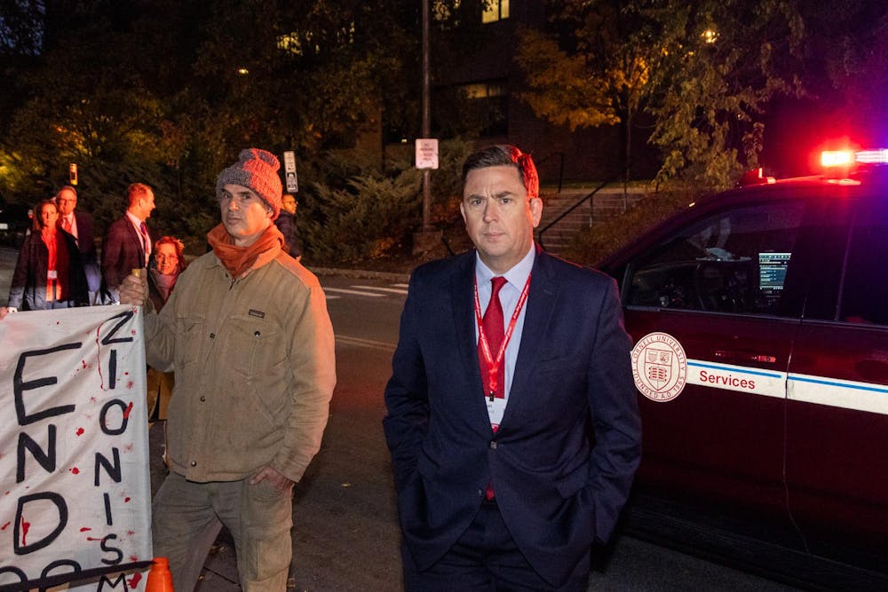 Ryan Lombardi, vice president for Student and Campus Life, walks past protesters demonstrating at the entrance of the Trustee-Council Annual annual reception in Barton Hall. Stephan Menasche