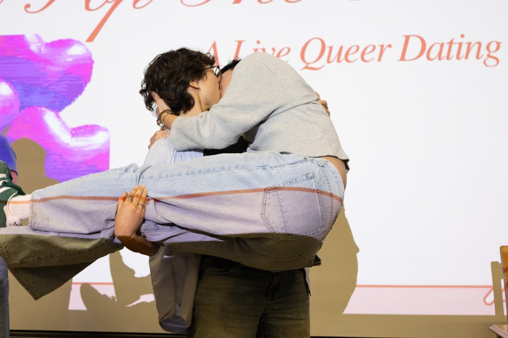 Contestants kiss each other in an effort to get louder crowd cheers to win the fifty dollar grand prize at the Big Red Moon Club and Perfect Match Bisexual Pop the Balloon event in Goldwin Smith Hall, Feb. 20, 2026. (Stephan Menasche/Sun Assistant Photography Editor)