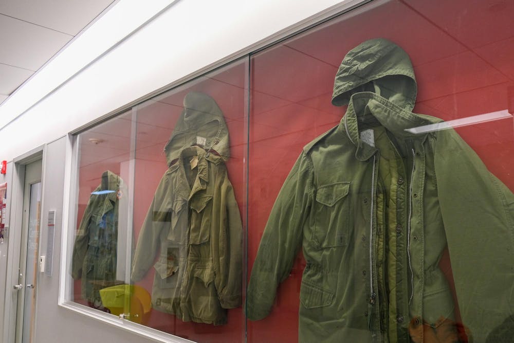 Display case of military jackets from the Fit for Duty exhibition in the Human Ecology Building, Feb.6.2026, (Adelaide Chow/Sun Staff Photographer)