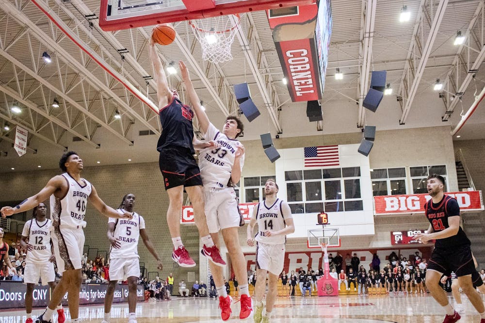 B brown vs cornell 2 rosey limmer.jpg Jake Fiegen '26 jumps to dunk as multiple defenders surround him.
