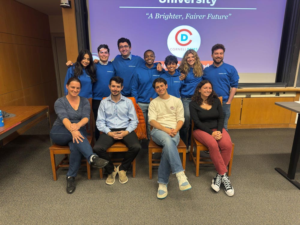 Cornell students were invited by the Cornell Democrats to meet four local candidates running for the Ithaca Common Council and the Tompkins County Legislature on Monday. Pictured left to right in the front: Prof. Judith Hubbard, earth and atmospheric sciences, Robin Trumble, Adam Vinson ’25 and Hannah Shvets ’27. (Courtesy of Ameera Aftab ’26)