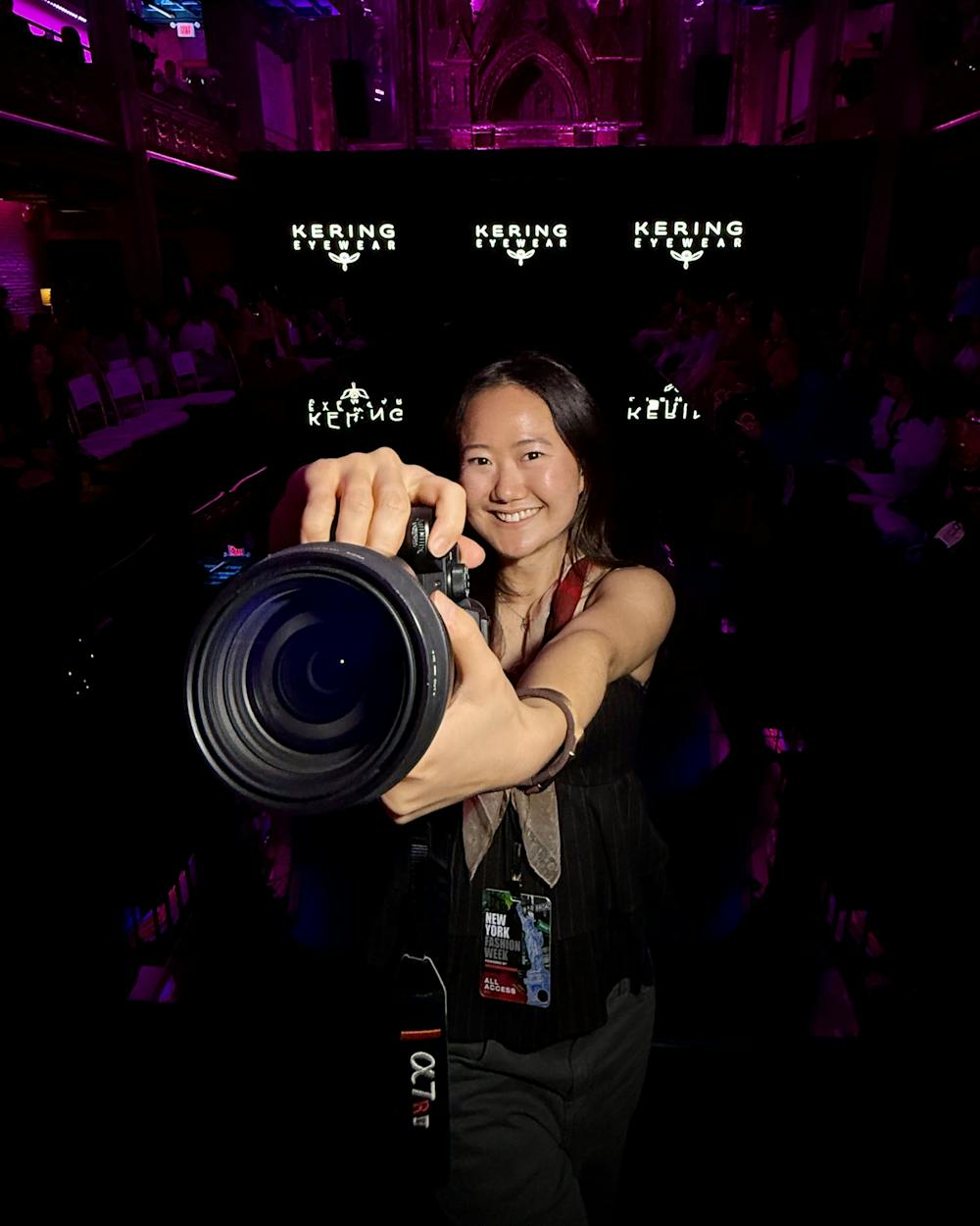 Julia Sun '26, NYFW Julia Sun '26 poses with her camera at a New York Fashion Week 2025 event. (Courtesy of Julia Sun)