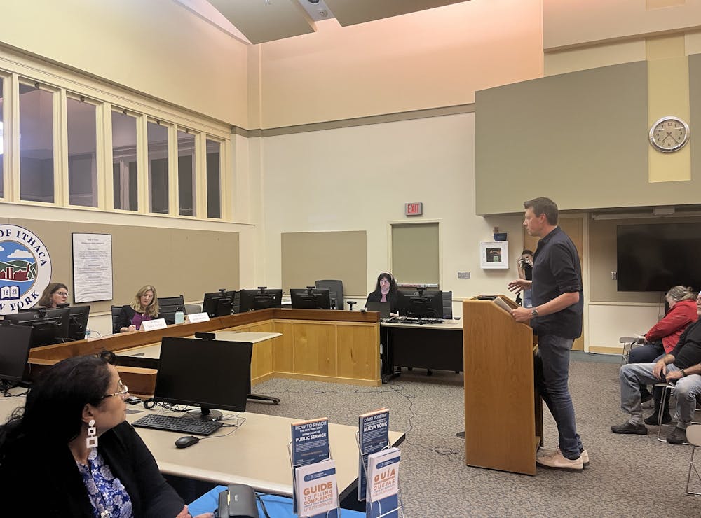 Rep. Josh Riley (D-N.Y.) was one of many people who against the New York State Electric and Gas Corporation’s proposed electricity bill costs at a Wednesday Ithaca Town Hall meeting. Atticus Johnson