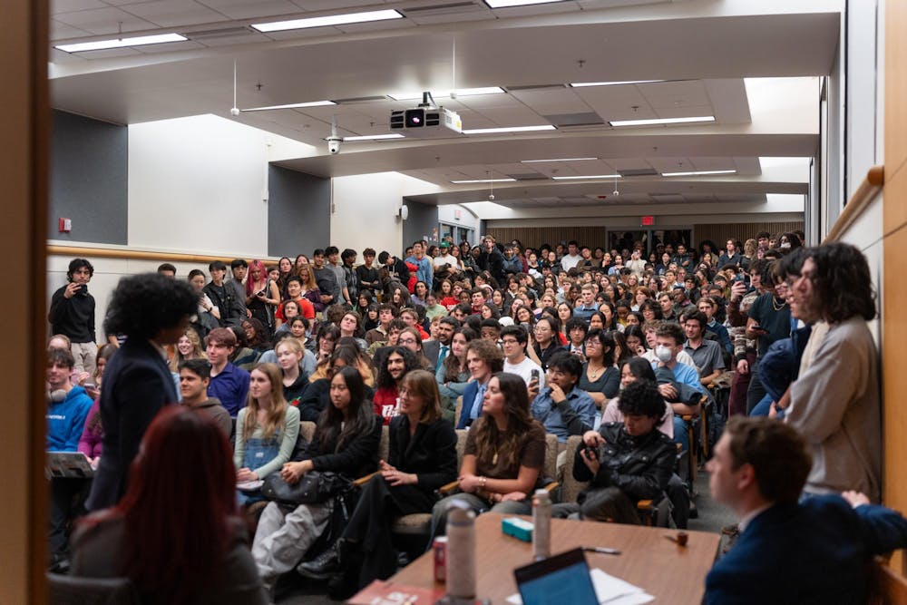 People overfilled the Kaufman Auditorium for Big Red Moon Club's "Is Pegging Gay?" debate in Goldwin Smith Hall, Feb. 10, 2026. (Stephan Menasche/Sun Assistant Photography Editor) Stephan Menasche