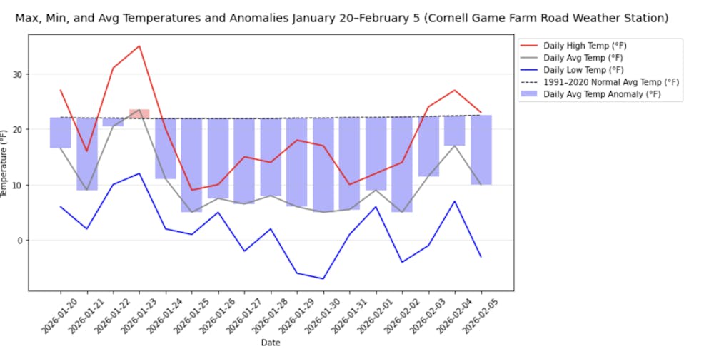 Daily high, low and average temperatures and anomalies at the University’s Game Farm Road Weather Station since the beginning of the spring semester. Jihan Bhuiyan