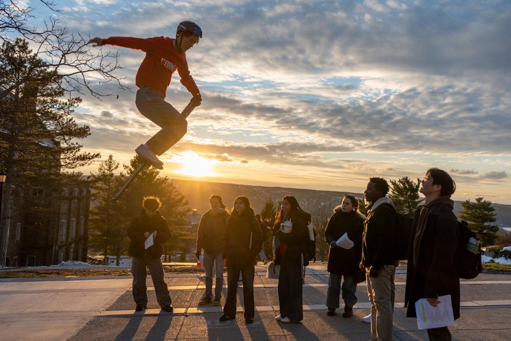 Anmo Li '28 pogos and shows fellow Cornellians how to pogo around Ho Plaza during sunset on March 18th, 2026. Sophia Romanov Imber