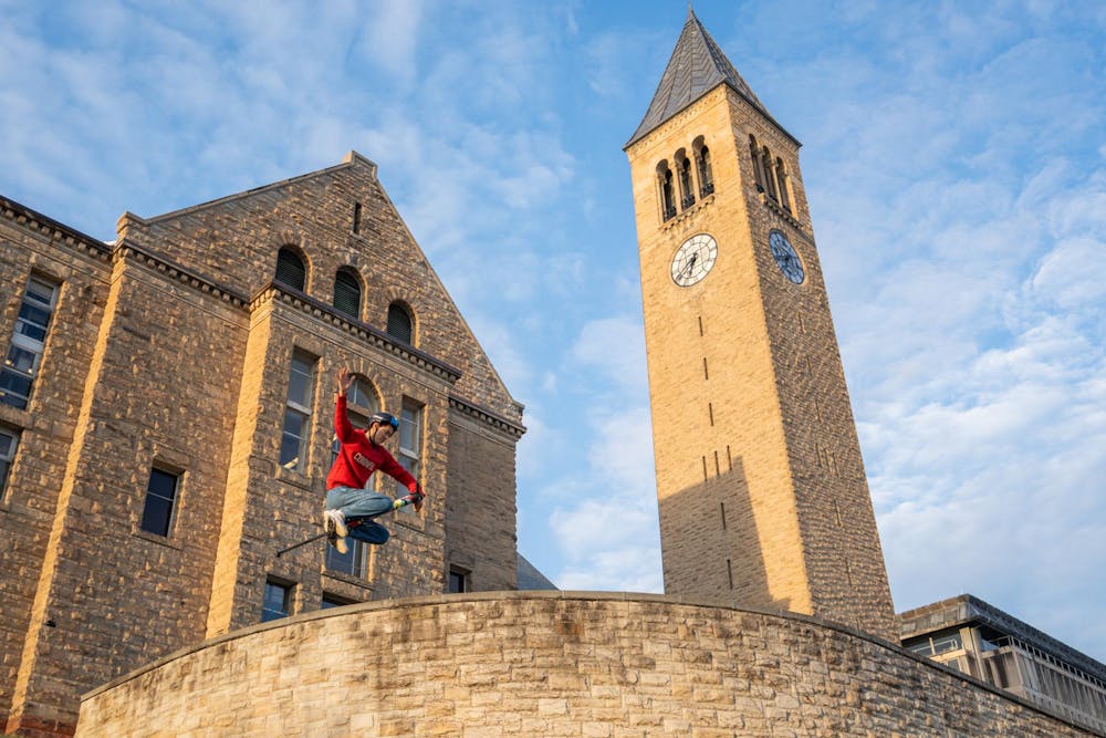 Anmo Li '28, founder of Cornell's Pogo Club, pogos across the walkway connecting Libe Slope and Ho Plaza. March 18, 2026. Adelaide Chow