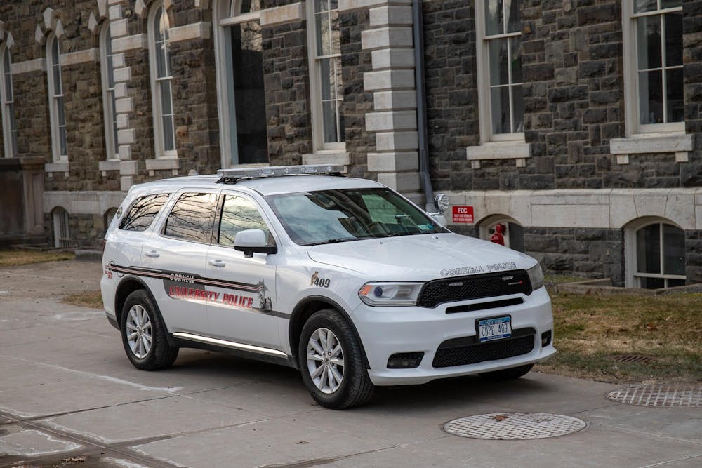 A CUPD (Cornell University Police Department) car by Milstein Hall on March 11 2021. Julia Nagel