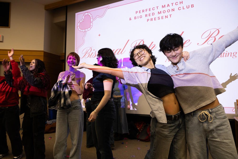 Contestants celebrate winning the fifty dollar grand prize at the Big Red Moon Club and Perfect Match Bisexual Pop the Balloon event in Goldwin Smith Hall, Feb. 20, 2026. (Stephan Menasche/Sun Assistant Photography Editor)