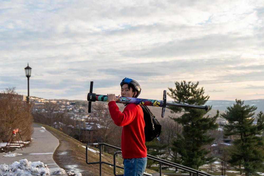 Anmo Li '28 carries his pogo gear across the walkway connecting Libe Slope and Ho Plaza. March 18, 2026. Adelaide Chow