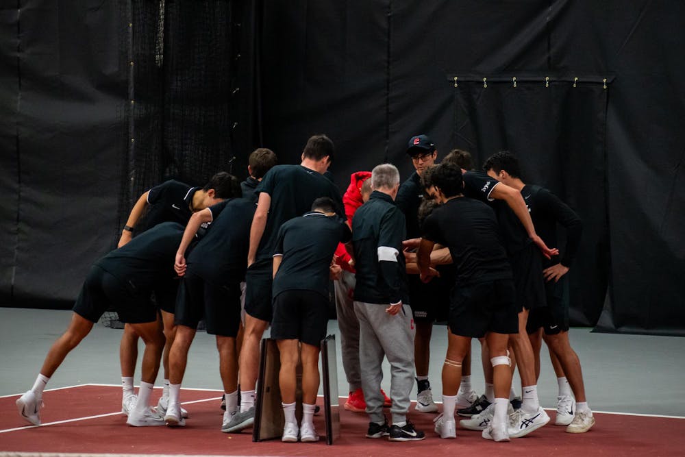 The Cornell team huddling before battling Princeton University, Apr. 11, 2025.