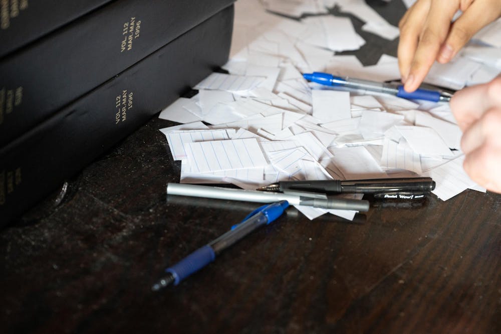 Sun staffers and editor compets cast paper ballots for editor-in-chief during the 144th Editorial Board elections on Feb. 28, 2026 at The Sun's office ballroom.