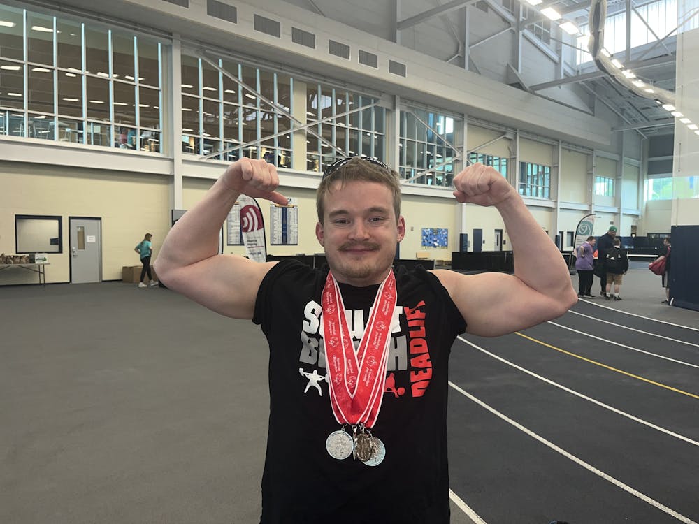 Ryan Ruvola flexes with his medals after lifting over 400 pounds in the powerlifting competition. Varsha Bhargava