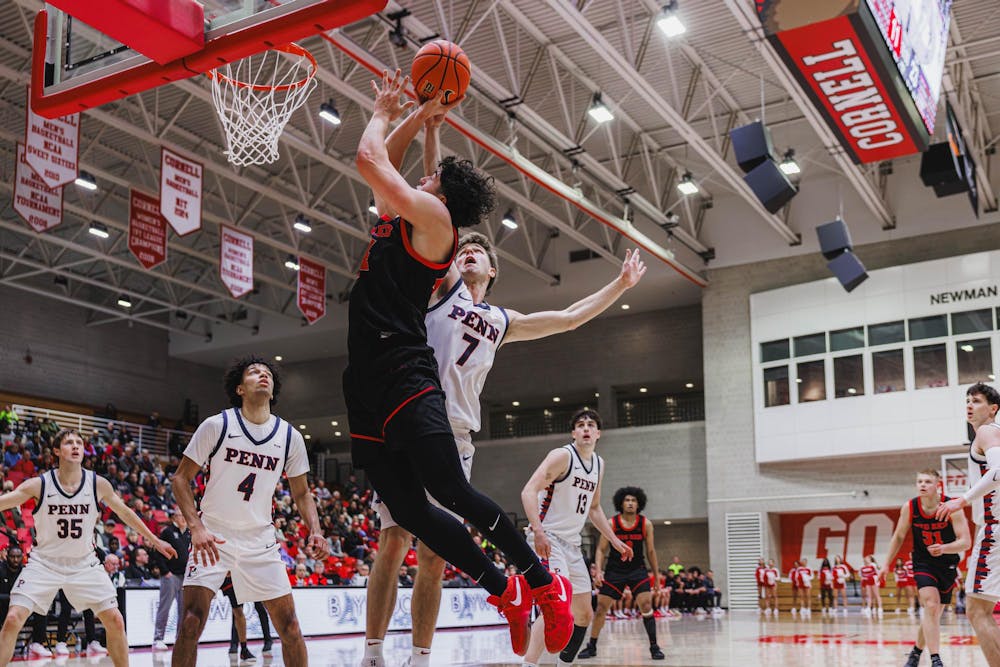 Josh Baldwin '26 is met at the rim against Penn, Newman Arena, Jan. 31, 2026. Timmy Xi