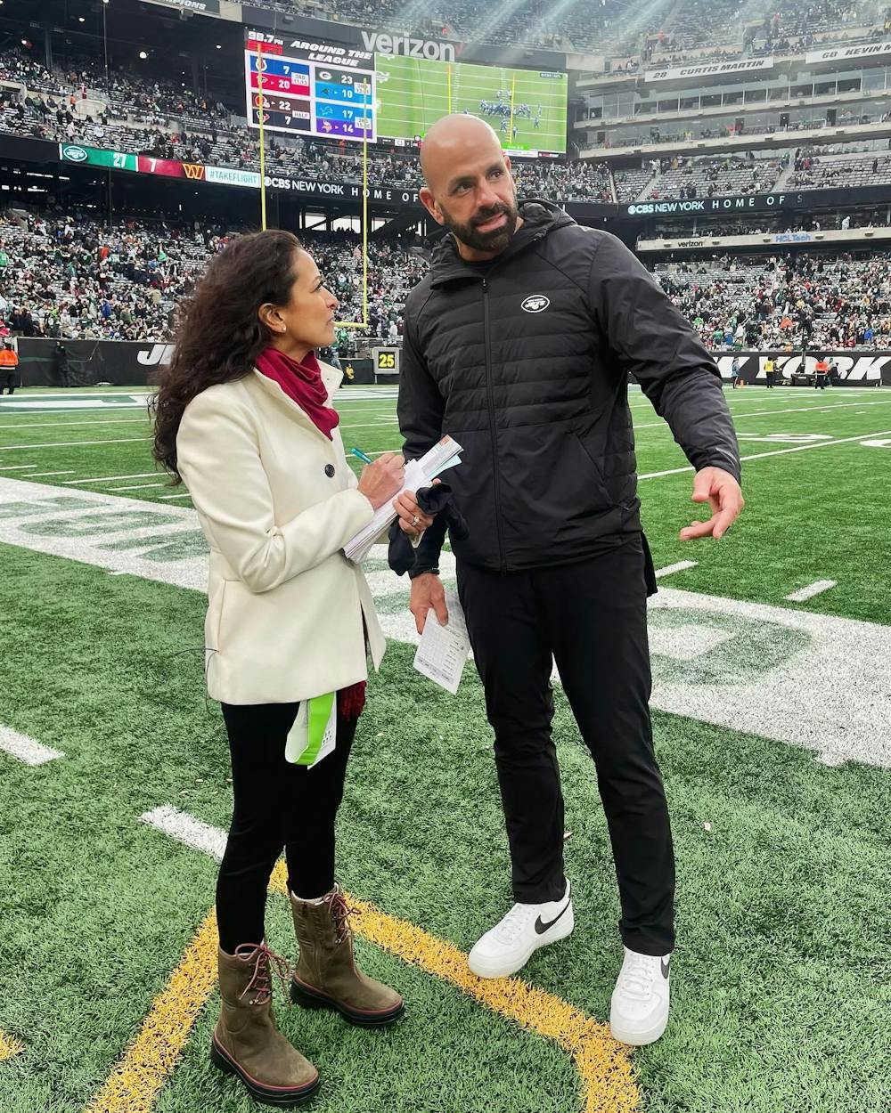 Aditi Kinkhabwala ’00 chats with former head coach of the New York Jets Robert Saleh. (Photo courtesy of Aditi Kinkhabwala)