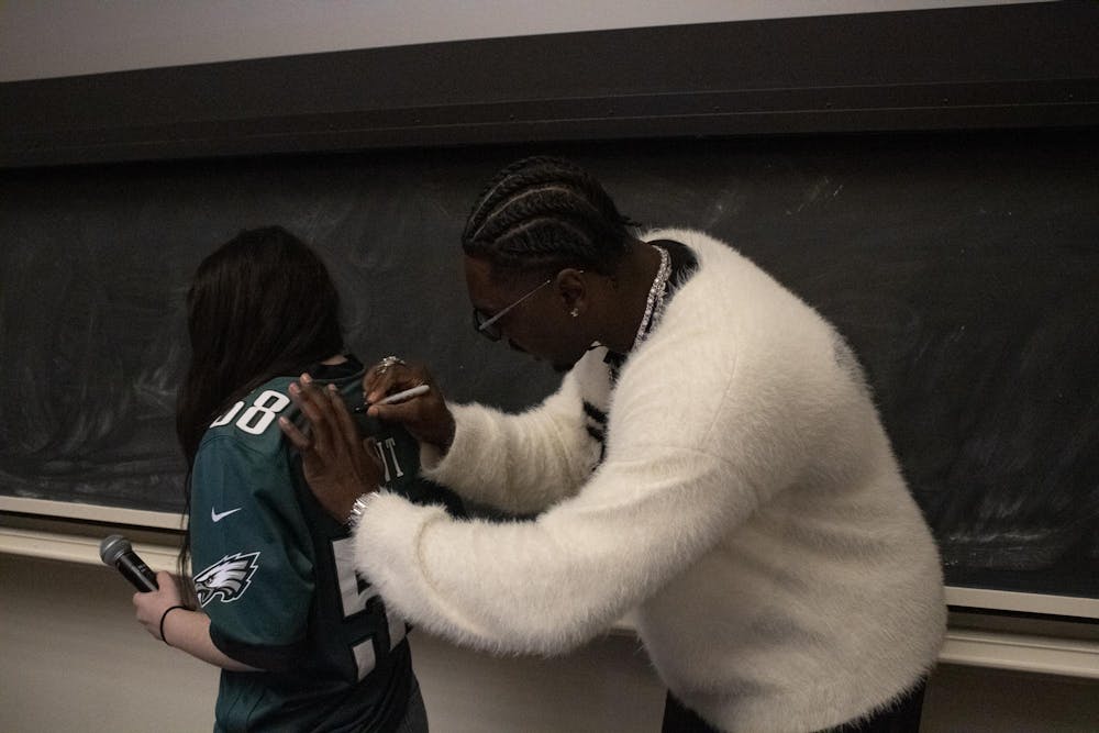 Jalyx Hunt signing the back of his own jersey on the Cornell student, Abbey Robinson ’26, who introduced his Last Lecture. Rosey Limmer