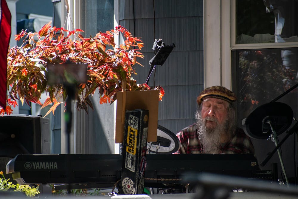 The main pianist of a band at Porchfest plays music. Camille Eckert