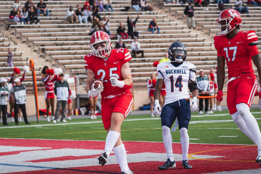 John McAuliffe '29 celebrates TD against Bucknell, Schoellkopf Field, Oct. 18, 2025. (Timmy Xi/Sun Staff Photographer)