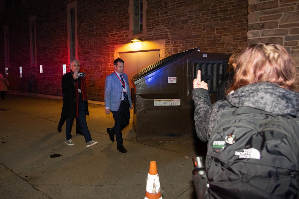 Sorin Lerner, soon-to-be dean of the Bowers College of Computing and Information Science, and another attendee walk towards protesters demonstrating at the entrance of the Friday's in Barton Hall. Stephan Menasche