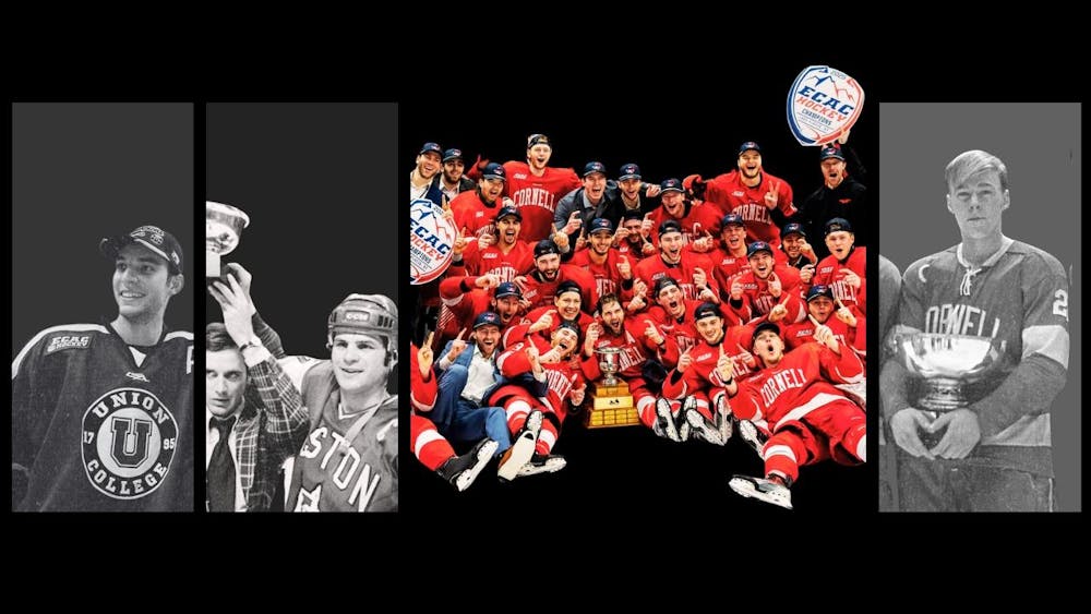This weekend, Cornell will look to accomplish something only three programs have ever accomplished. Graphic by Jane McNally, photos courtesy of Leilani Burke/Sun File Photo, Richard Gagnon/Getty Images, BU Photography, Jim Cunningham/Cornell Athletic Communications.