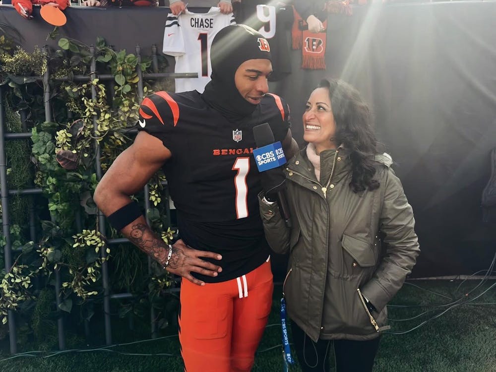 Aditi Kinkhabwala ’00 on the sidelines with Cincinnati Bengals wide receiver Ja'Marr Chase following the Bengals win against the Cleveland Browns on Dec. 22. (Photo by Chuck Denton/CBS)