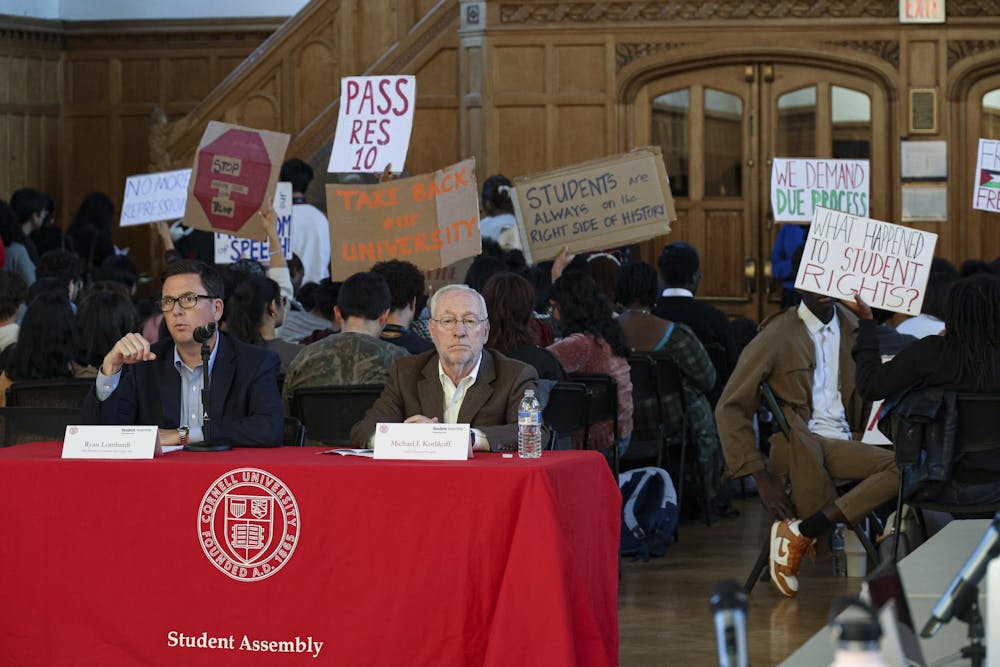 Students held up signs and turned their backs as President Michael Kotlikoff and Ryan Lombardi, vice president of Student and Campus Life, adressesed the Student Assembly. Benjamin Leynse