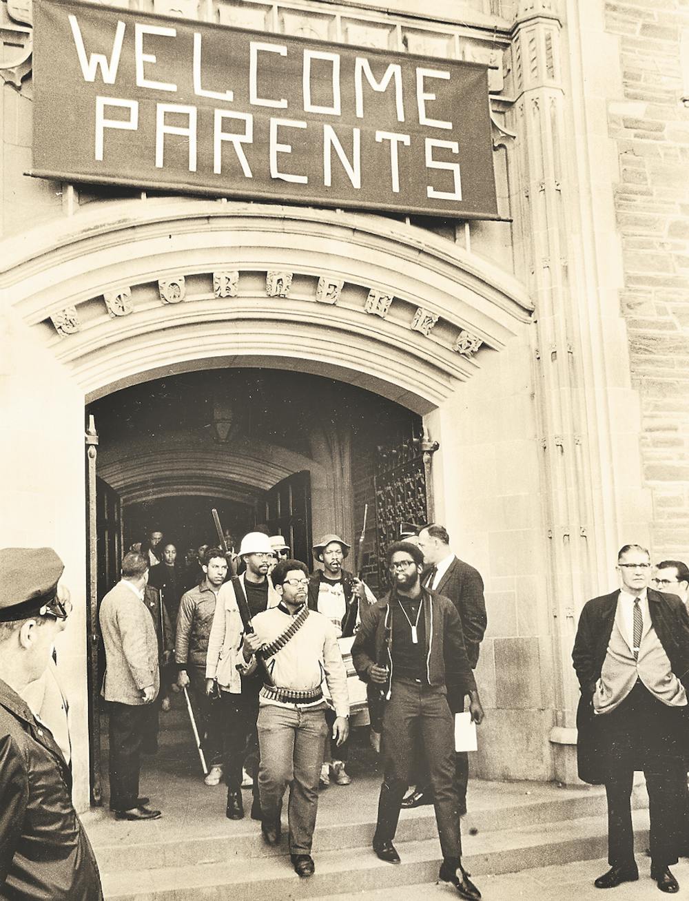 Eric Evans '69 and Edward Whitfield '70 walk out of Willard Straight Hall after having occupied the building on April 19 and 20, 1969. (Brian W. Gray/Sun File Photo)