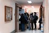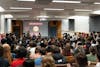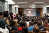 People standing outside of the Kaufman Auditorium entrance to catch a glimpse of Big Red Moon Club's "Is Pegging Gay?" debate in the Goldwin Smith Hall, Feb. 10, 2026. (Stephan Menasche/Sun Assistant Photography Editor)