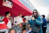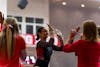 Sarah Goetter '28 high-fives her coach and teammates after her vault.