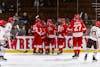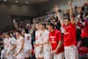 The Red's bench gets hype against Colgate, Newman Arena, Nov. 20, 2025.