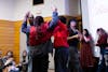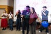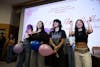 Contestants celebrate winning the fifty dollar grand prize at the Big Red Moon Club and Perfect Match Bisexual Pop the Balloon event in Goldwin Smith Hall, Feb. 20, 2026. (Stephan Menasche/Sun Assistant Photography Editor)
