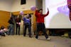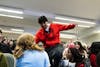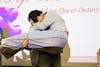 Previous contestant walks to the front of the room to play a round of real-life dating app swiping at the Big Red Moon Club and Perfect Match Bisexual Pop the Balloon event in Goldwin Smith Hall, Feb. 20, 2026. (Stephan Menasche/Sun Assistant Photography Editor)