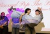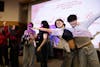 Three contestants celebrate their polyamorous match at the Big Red Moon Club and Perfect Match Bisexual Pop the Balloon event in Goldwin Smith Hall, Feb. 20, 2026. (Stephan Menasche/Sun Assistant Photography Editor)