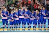 Rory Guilday '25 (fifth from right) and her teammates celebrate after defeating Canada 2-1 in the gold medal game. Photo courtesy of Andrea Cardin/IIHF