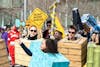 AAP students parade down Feeney Way in costumes. A student holds a road work ahead sign.