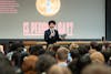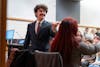 Max Troiano '28 presents his closing argument at Big Red Moon Club's "Is Pegging Gay?" debate in the Goldwin Smith Hall Kaufman Auditorium, Feb. 10, 2026. (Stephan Menasche/Sun Assistant Photography Editor)